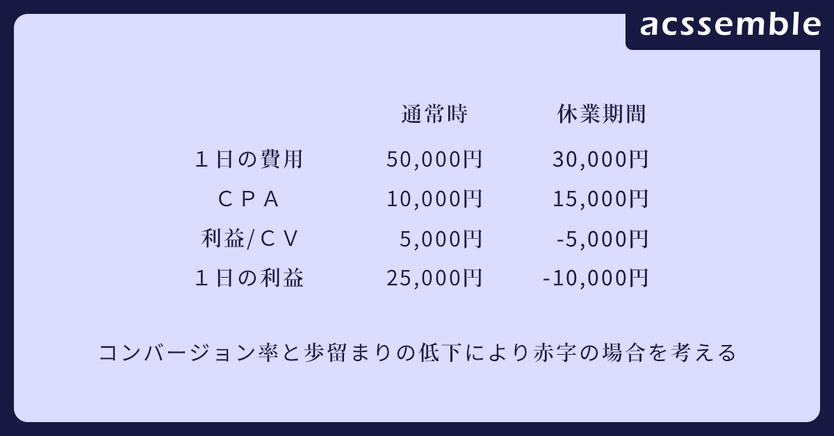 休業期間については、どんなに入札とターゲティングを絞ってコンバージョン単価を下げても、歩留まりの低下によって広告経由の獲得は赤字になってしまうケースを考えてみます。この場合、休業期間は広告を停止すべきです。