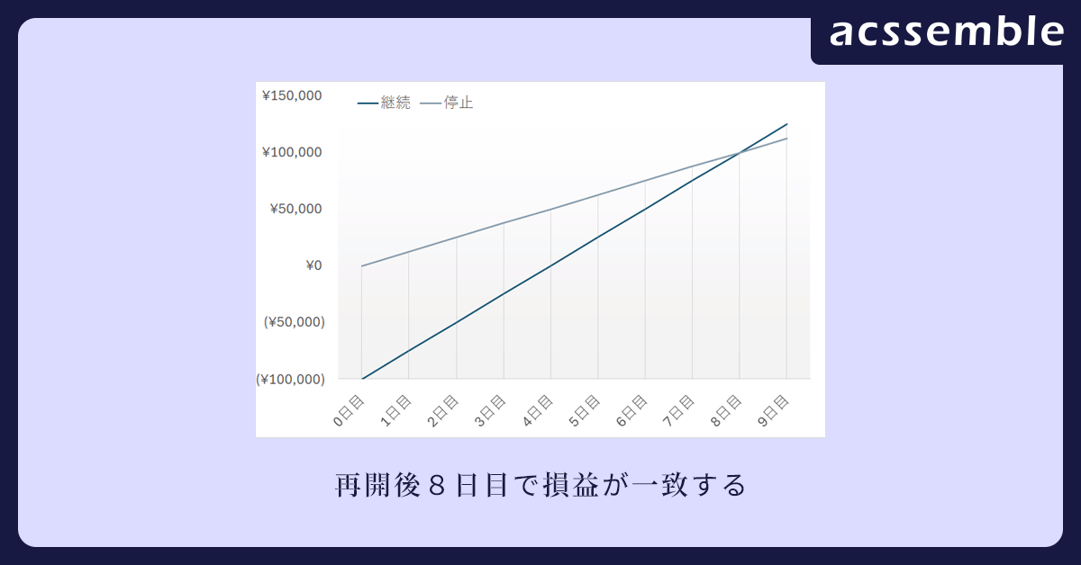 休業期間が10日間の場合、休業期間の利益はマイナス10万円です。配信を継続した場合は休業期間が明けた初日から1日の利益が通常時と同じ2.5万円なのに対して、配信を停止した場合は学習のリセットによりコンバージョン数が減少して1日の利益が半分になるとします。この場合、配信停止による影響が8日以内に解消されるなら広告を停止したほうがトータルの利益が大きく、影響が9日以上継続するなら広告を停止しないほうが利益が大きくなります。